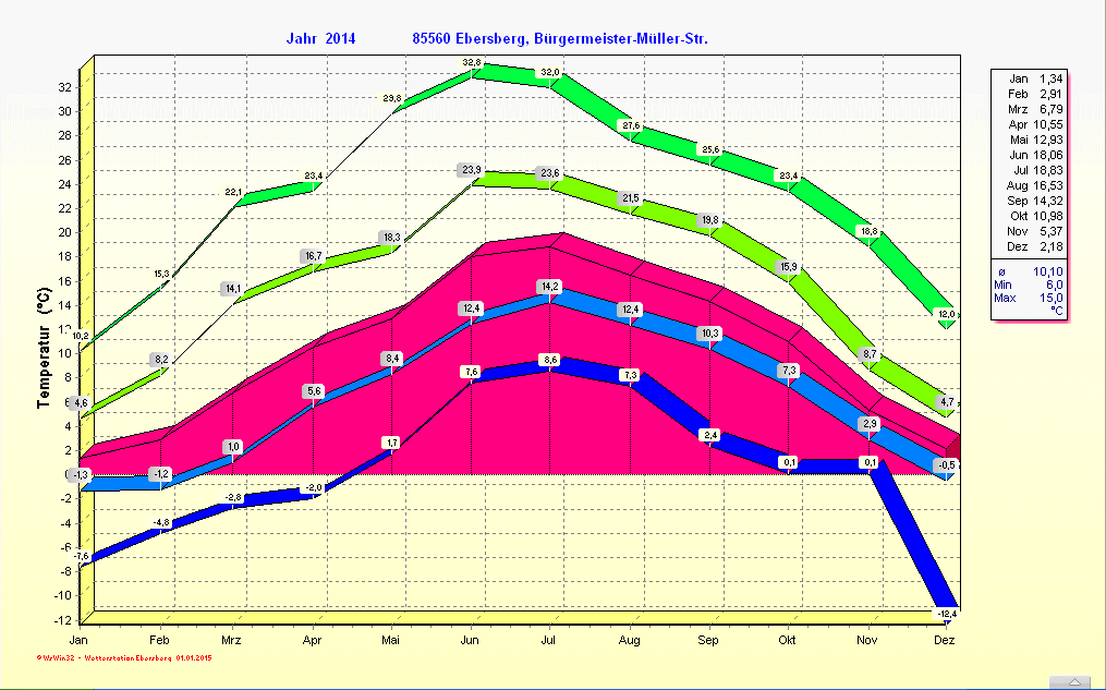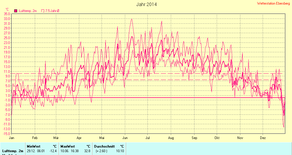 Temp. Min- Max- Werte 2014 | Monatl. Temperaturen 2014 | Monatl. Niederschläge und Sonnenstunden 2014 |