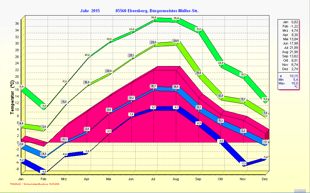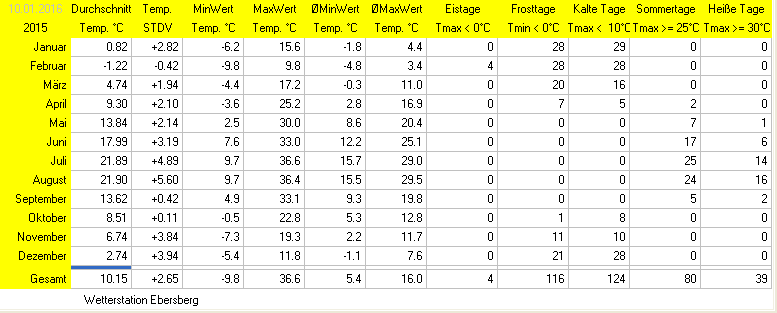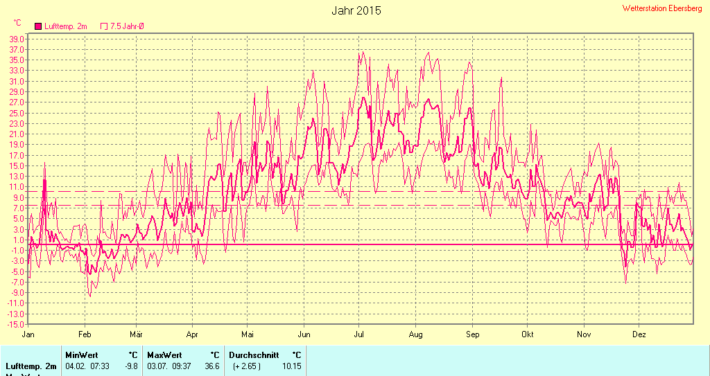 Temp. Min- Max- Werte 2015 | Monatl. Temperaturen 2015 | Monatl. Niederschläge und Sonnenstunden 2015 |